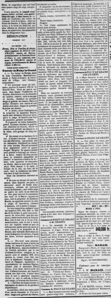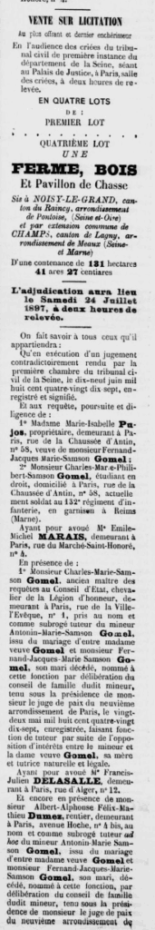 La succession GOMEL (madame et ses deux fils) mit en vente par adjudication sans succès la ferme de Noisy, qui était donnée en fermage.