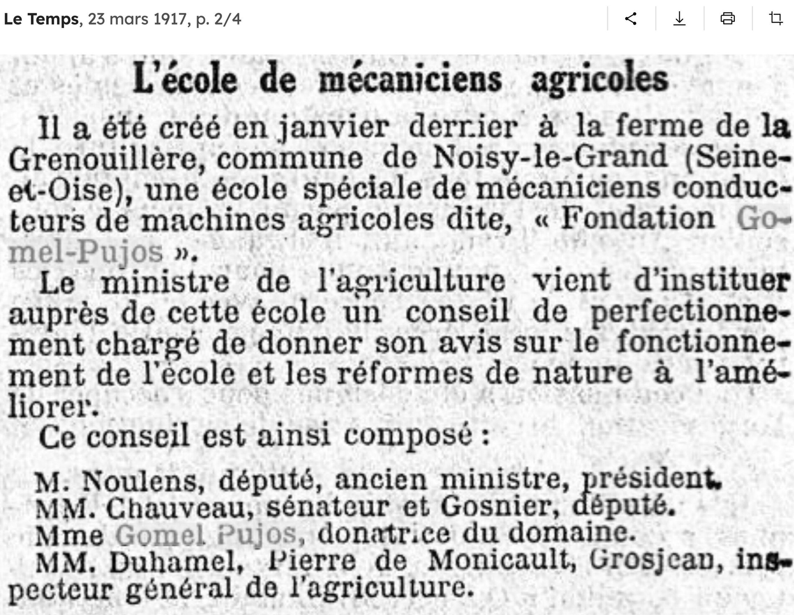 Les GOMEL PUJOS possédaient déjà la Ferme du Château des Landes à Suresnes et avaient récemment fait l’acquisition de la ferme de l’ancienne Manufacture (appelée par erreur Ferme de la Grenouillère sur les cartes postales de 1914) soit 181 hectares de graines et de prés, situé à cheval sur Noisy-le-Grand et Champs-sur-Marne.